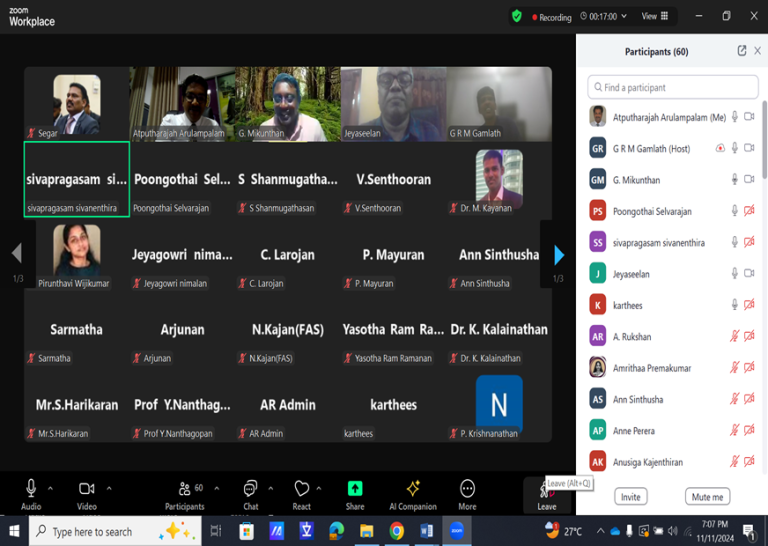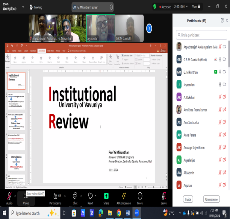 The Centre for Quality Assurance jointly organised a discussion for an introduction to institutional review on 11.11.2024 via online. The co-organiser was the Staff Development Centre. All academic and non-academic staff of the University of Vavuniya participated in this discussion.