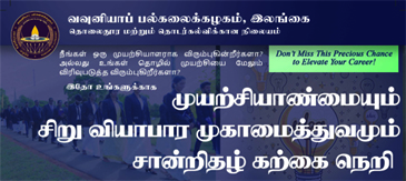 The University of Vavuniya intends to introduce a Certificate Course on Entrepreneurship and Small Business Management to equip students for the future, since the impact of the crisis in our lives is increasing in various needs and wants. This certificate program is mostly targeted at school leavers (Grade 9 or above), because entrepreneurship education teaches essential life skills such as innovative problem-solving, resolving real-world challenges, and teamwork.
