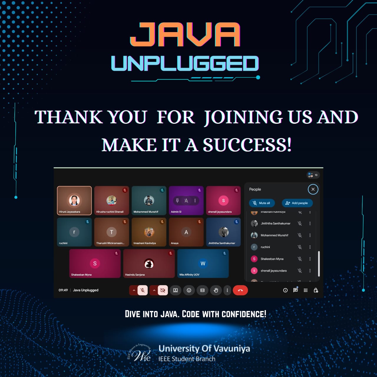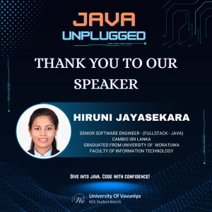 Java Unplugged was successfully conducted as an engaging and interactive online session organized by the IEEE Women in Engineering Affinity Group – University of Vavuniya of the University of Vavuniya.