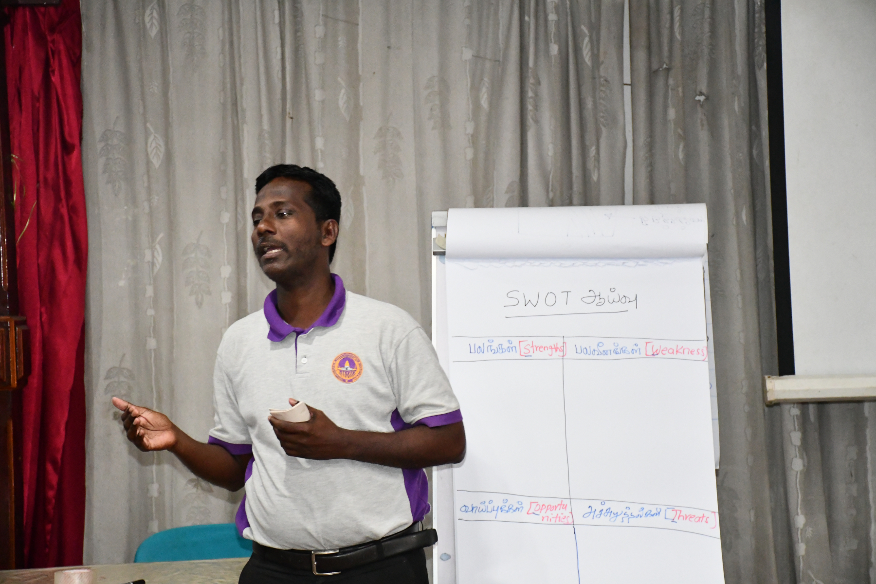 Mr. S. Sivagengatharan, CEFE Lead Trainer, Provincial Director (North),Ceylon Industrial Development Board  & Mr. M. Amirthananthan, Admin cum Finance Officer,  North and East Economic Development [NEED] Centre, Vavuniya, served as resource persons for this Training Programme. Staff actively participated and gained knowledge about Personality Development, Communication Skills, Interpersonal Relationship, Leadership and Time Management.  Since the resource persons are experts in this area, they conducted it as an interactive session with activities and games. Participant enjoyed this whole day training session and learned Career Development and Organizational Behavior.